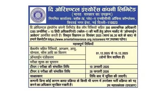 Oriental Insurance Company Limited (OICL) ने Administrative Officer (Scale-I) पदों पर कुल 300 रिक्तियों के लिए नया भर्ती विज्ञापन जारी किया है। यदि आप OICL में Administrative Officer के पद के लिए आवेदन करना चाहते हैं तो इस आर्टिकल में आपको पूरी भर्ती से जुड़ी जानकारी विस्तार से प्राप्त होगी। कृपया अंत तक ध्यानपूर्वक पढ़ें।